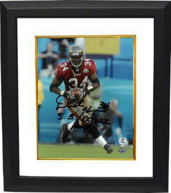 Dexter Jackson is a former professional American football safety in the National Football League (NFL). He was drafted by the Tampa Bay Buccaneers in the fourth round of the 1999 NFL Draft. He played college football at Florida State. Jackson earned a Super Bowl ring with the Buccaneers in Super Bowl XXXVII and was also named MVP. Dexter Jackson has hand signed this Tampa Bay Buccaneers 8x10 Photo from Super Bowl XXXVII with #34 SB XXXVII MVP Inscription. Jackson Hologram Certificate of Authenticity from Athlon Sports Collectibles. Custom White Mat and Premium Black Color Framed as shown.