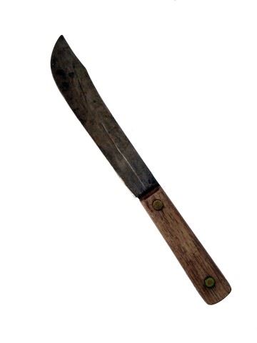 Rustic knife with wooden handle and metal blade from the TV series Dexter (2006-2013), about a forensics expert who moonlights as a vigilante serial killer. Special effects grooves and rust give the knife a worn appearance. From the TV series Dexter (2006-2013),Made of metal and wood. Approx. 11 1/2" long.
