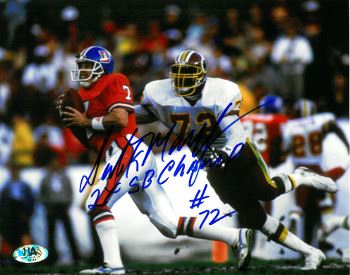 Dexter Manley was drafted in the fifth round (119th overall) of the 1981 NFL Draft by the Washington Redskins, where he would play for nine seasons. During his career with the Redskins, Manley won two Super Bowl titles and was a Pro Bowler in 1986 when he recorded 18.5 sacks. Dexter Manley has hand autographed this Washington Redskins 8x10 Photo with #72 2X SB Champs. MAB Hologram and Certificate of Authenticity from Athlon Sports.