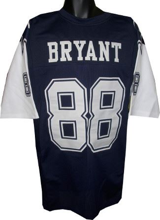 The Cowboys traded their 27th overall pick in the 2009 NFL Draft to the New England Patriots for their 24th overall pick to select Dez Bryant. Bryant finished his rookie season with 45 receptions for 561 yards and 6 receiving touchdowns. Bryant finished the 2011 season with 63 receptions for 928 yards and 9 touchdowns. This is a Dez Bryant Dallas Cowboys unsigned Blue 2 Star unlicensed custom-prostyle jersey with twill stitched nameplate and numbers. perfect for autograph or to wear! Size XL