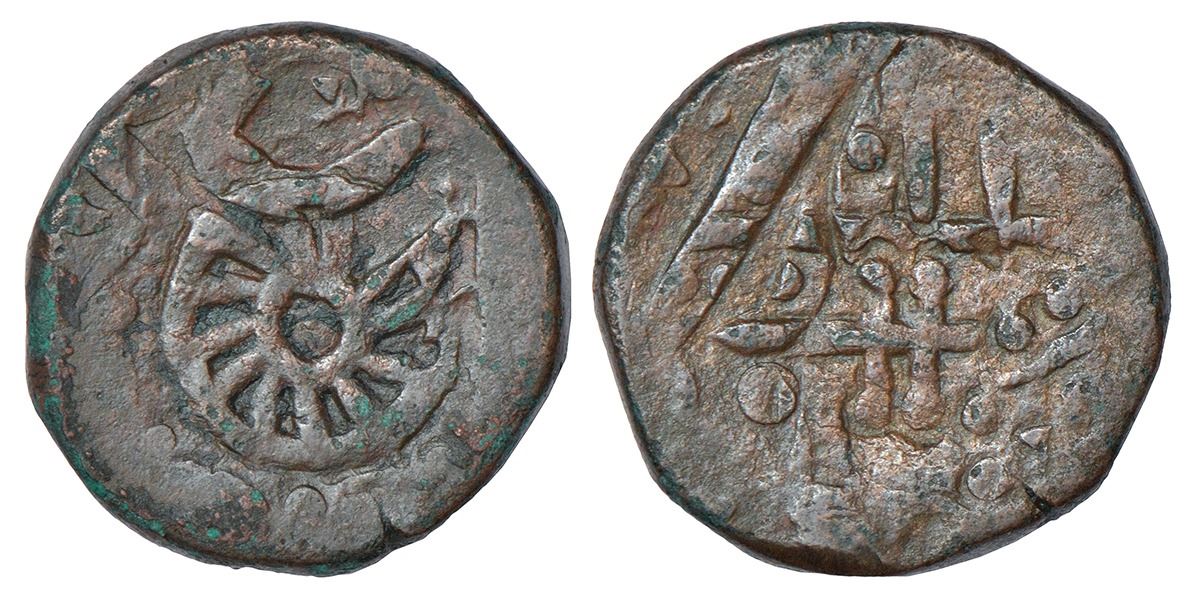 Dhar, copper paisa, in the name of Shah Alam II, unlisted in KM, 12.52g. Obv: Wheel. Rev: Sword.