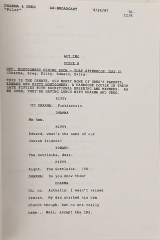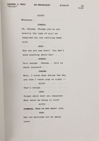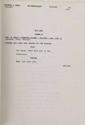 Dharma & Greg signed, original, pilot script, Episode #AE79.Signed by Jenna Elfman, Joel Murray, Mimi Kennedy, Mitchell Ryan, Susan Sullivan, Shae D'lyn and Camryn Manheim. Directed by James Burrows. September 24,1997.