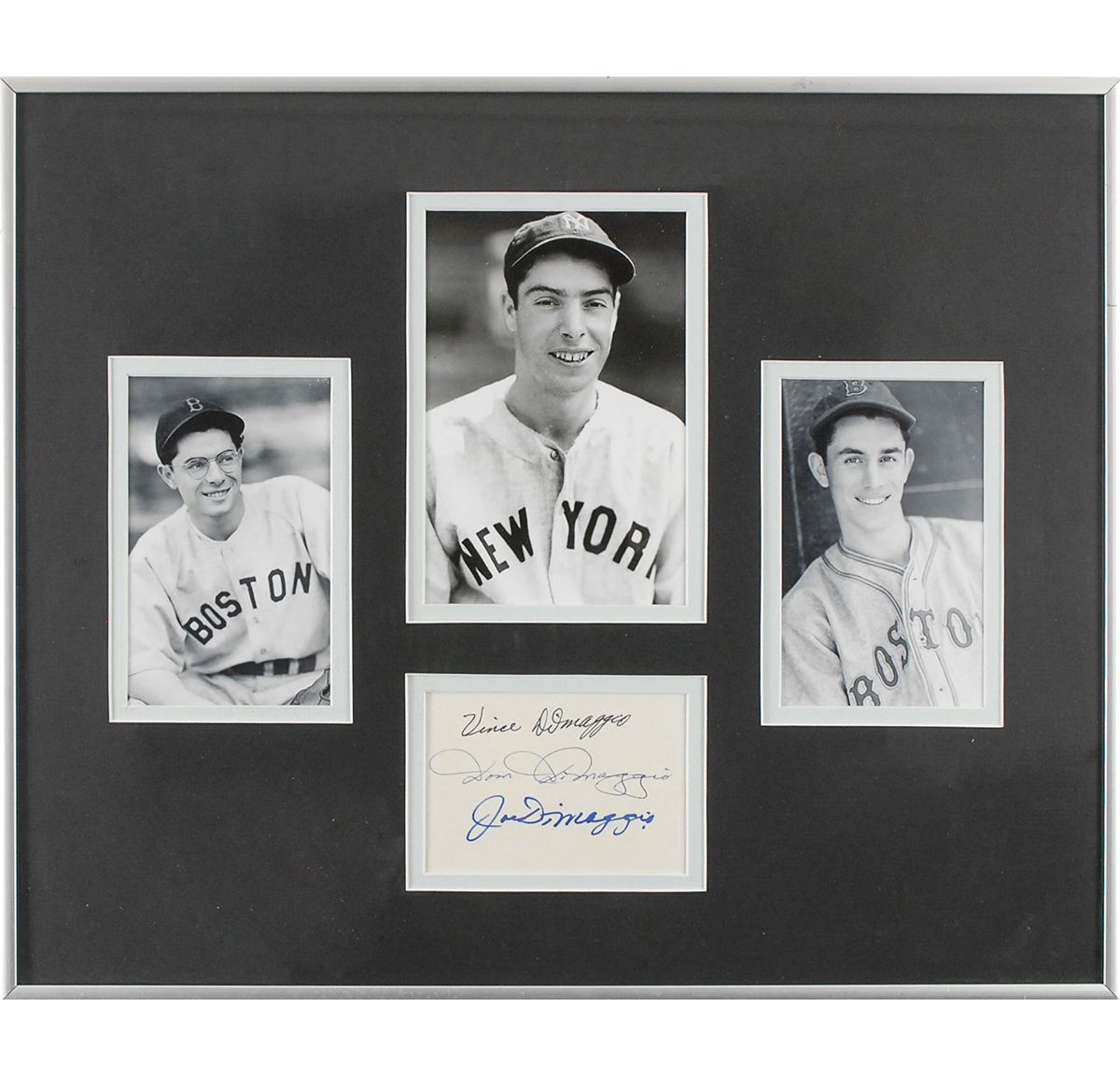Felt tip and ballpoint signatures of Joe DiMaggio, Dom DiMaggio, and Vince DiMaggio on an off-white 4 x 2.75 card. Attractively double-matted and framed with images of all three to an overall size of 18 x 15. In fine condition. An uncommon combination for a single item.