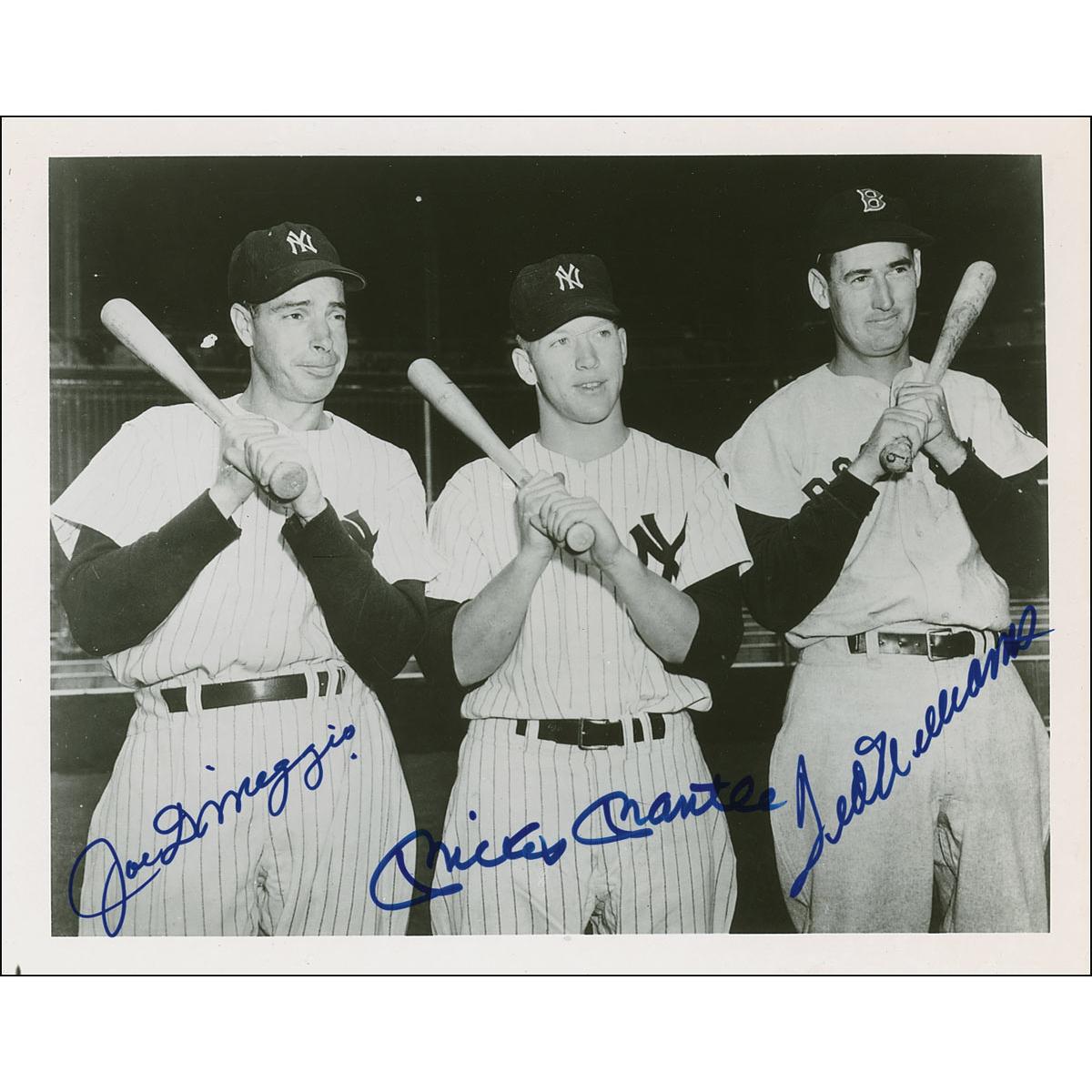 Glossy 10.25 x 8.25 photo of Joe DiMaggio, Mickey Mantle, and Ted Williams posing together with their bats on their shoulders in 1951, signed in blue felt tip by all three. In fine condition.