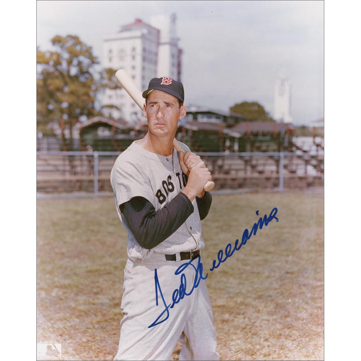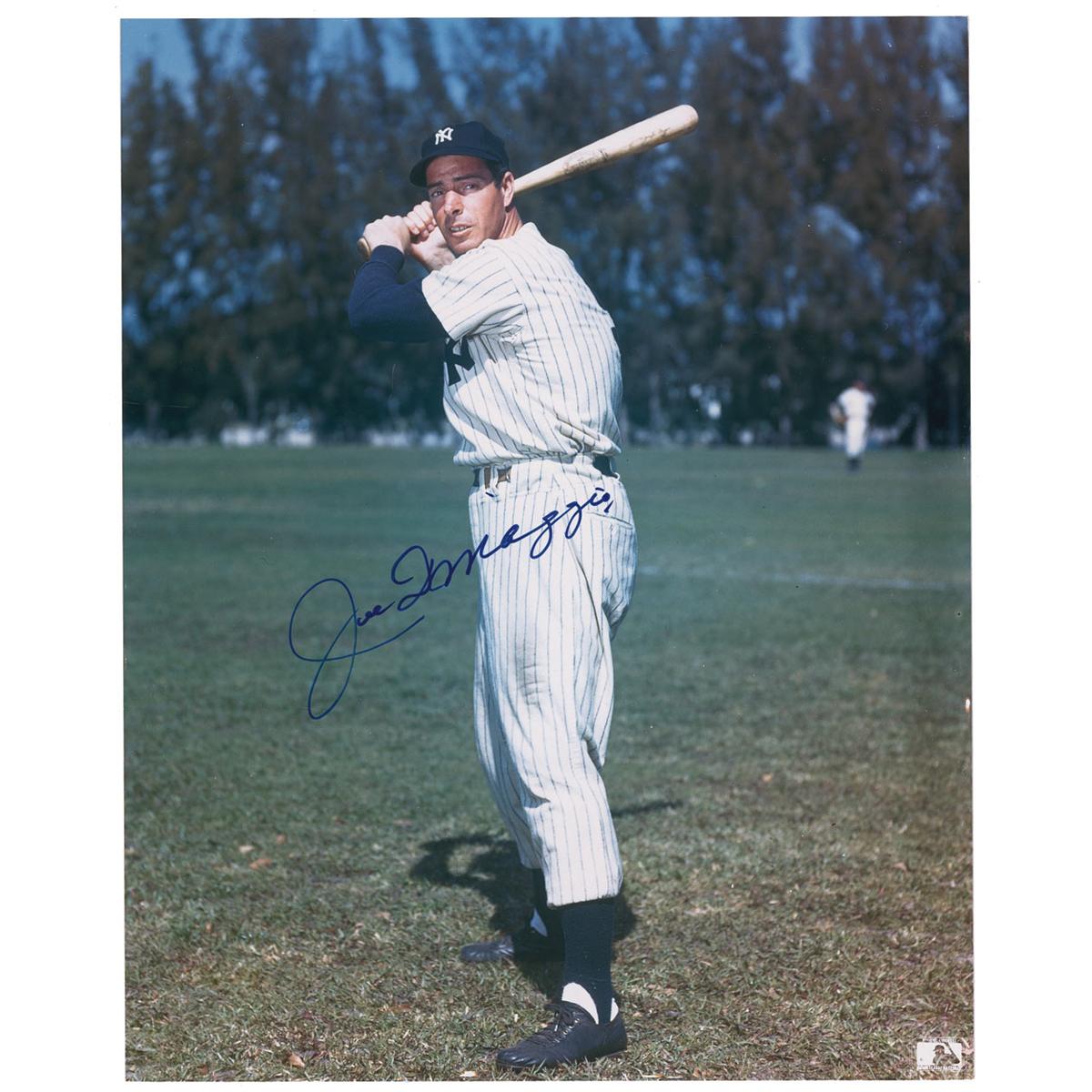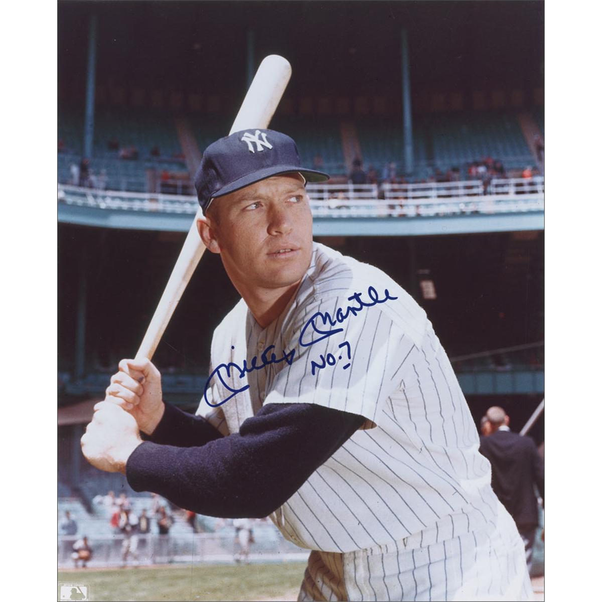 Three glossy 8 x 10 photos of Joe DiMaggio, Mickey Mantle, and Ted Williams in uniform, each respectively signed in blue felt tip, with Mantle adding “No. 7” to his photo. In overall fine condition.