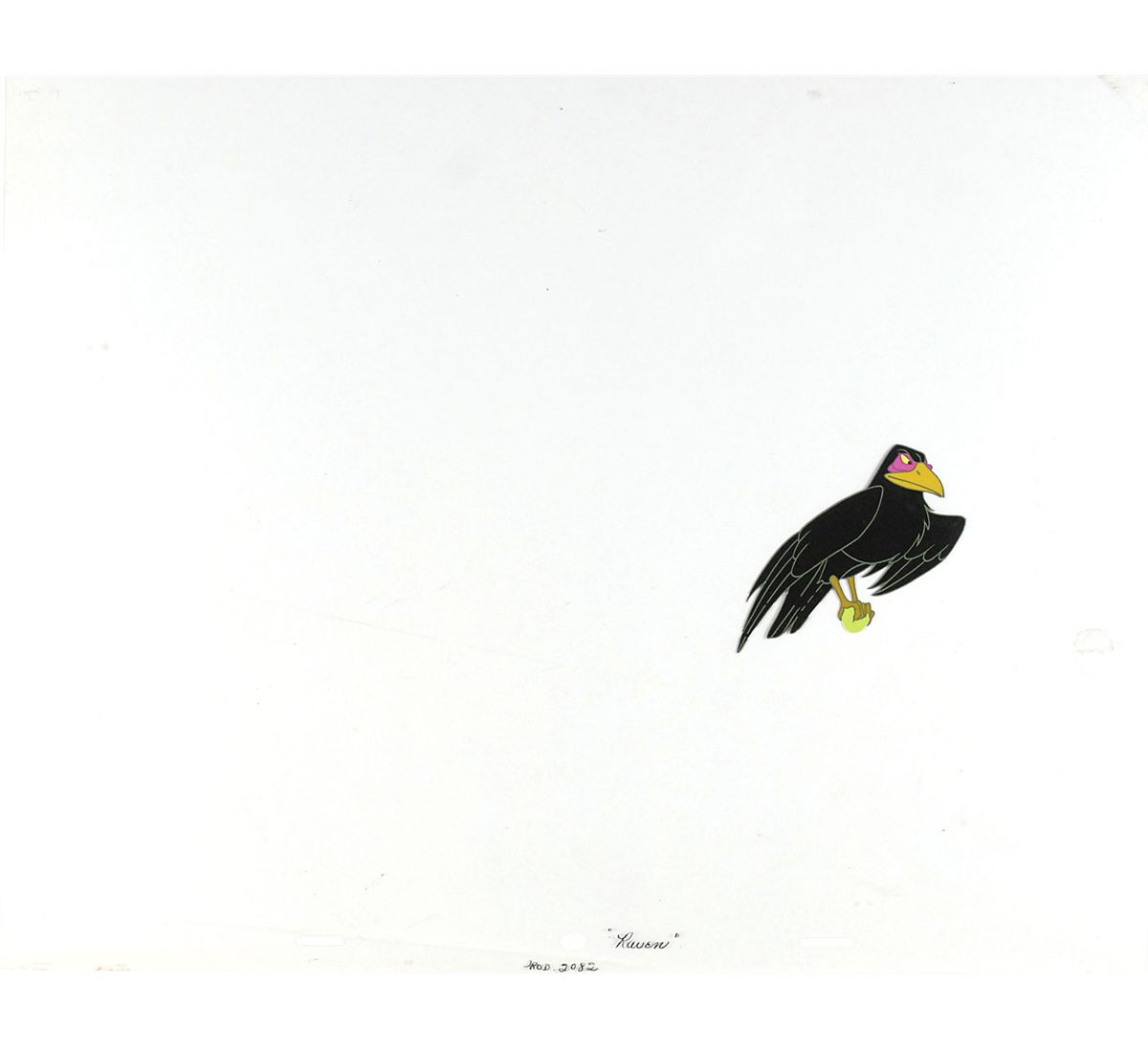 (Walt Disney Studios, 1959) Original production cel featuring Diablo from Sleeping Beauty. Image of Diablo sitting atop the green orb of Maleficent’s staff measures 3.25 x 3, with overall dimensions of 16 x 12.5, and is labeled along the bottom by an animator, “Raven.” In fine condition.
