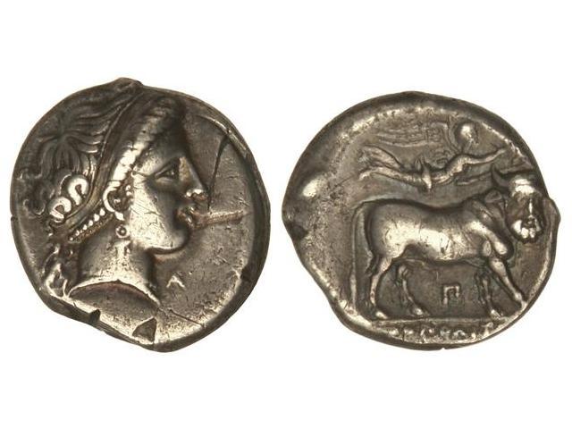 Diadracma. - 340-241. - NEAPOLIS. - Anv.: Cabeza diademada de ninfa a derecha. Rev.: Toro androcéfalo a derecha coronado por Nike volando. En exergo: leyenda. 7,10 grs. AR. (Rayas). Se-307 var. MBC+. - -