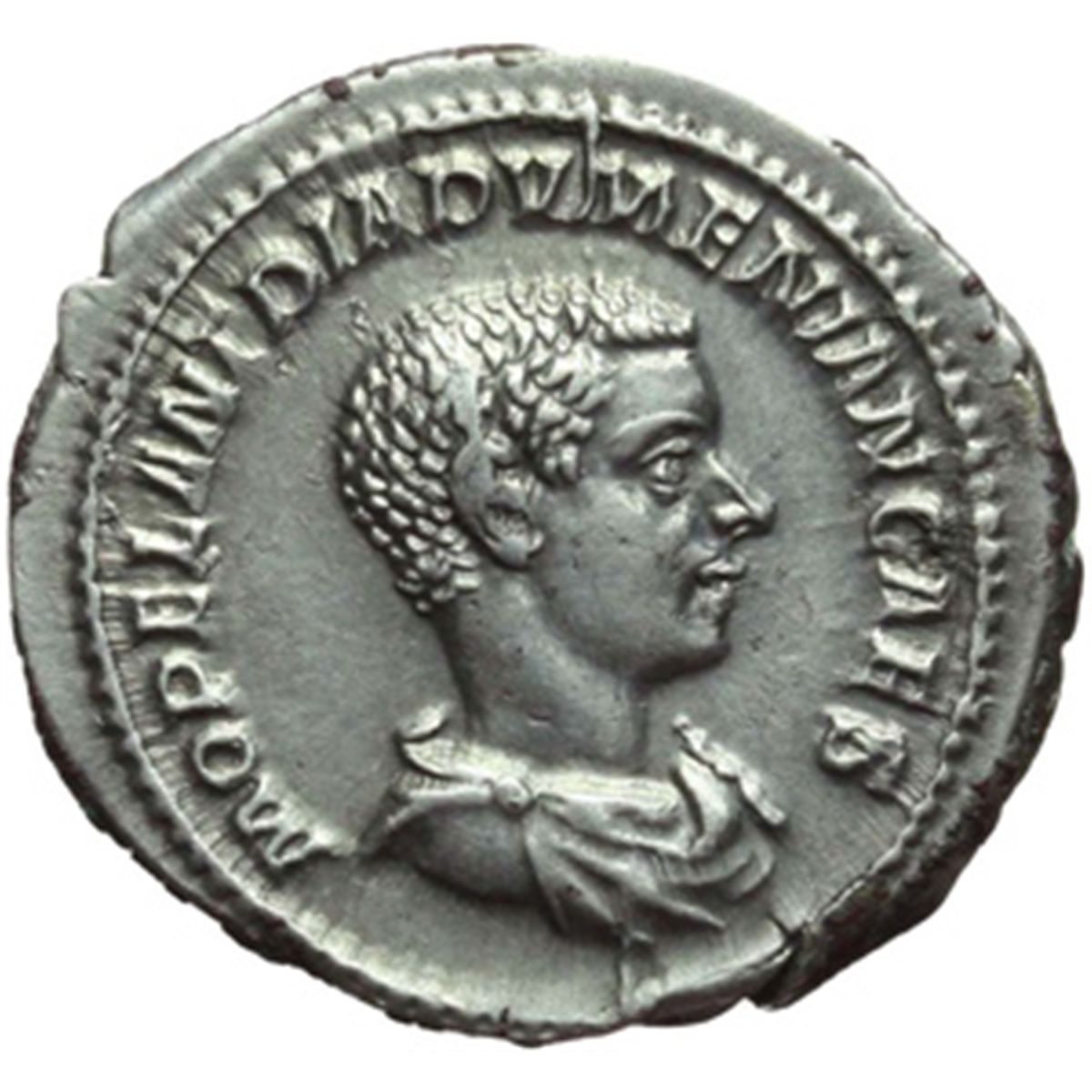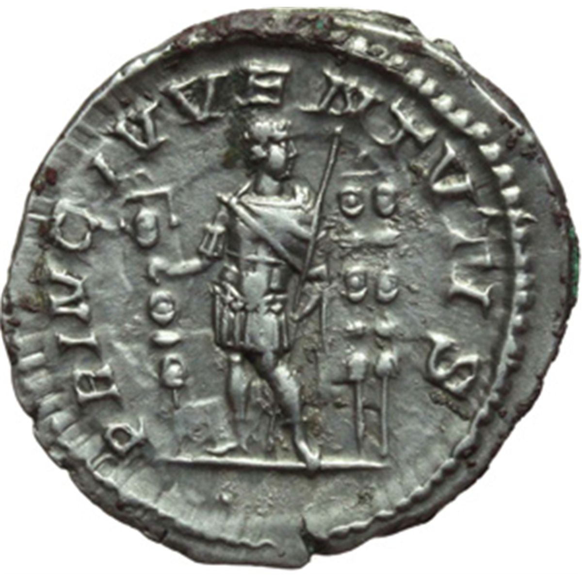 Impero Romano. Diadumeniano (218 d.C.). Denario. D/ M OPEL ANT DIADVMENIAN CAES. Busto a testa nuda, drappeggiato e corazzato a destra. R/ PRINC. IVVENTVTIS. Diadumeniano, stante di fronte con il capo a destra, tiene asta e insegna. A destra, due insegne. RIC 102. AG. g. 3.39 mm. 21.00 R. Un ritratto di grande stile. Delicata patina di monetiere su fondi lucenti. SPL/qSPL.