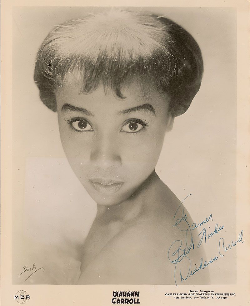 Vintage glossy 8 x 10 photo, signed and inscribed in blue ink, “To James, Best wishes, Diahann Carroll.” In fine condition, with a few light creases.