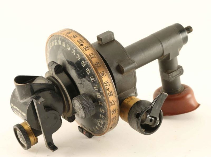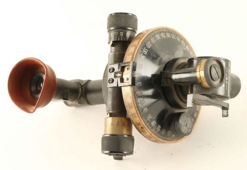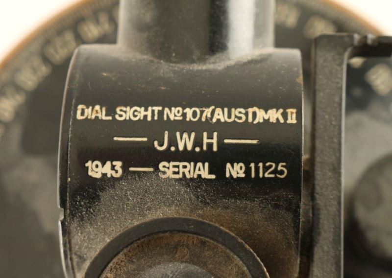 Made in Australia 1943 for a 25 pounder field gun. The sight has a post fitting with an eyepiece and adjustable range drums for elevation and windage. Inscribed on the top of the sight is 'DIAL SIGHT NO107(AUST)MK.II - J.W.H - 1943 - SERIAL NO 1125'. From The John F Sukey Collection