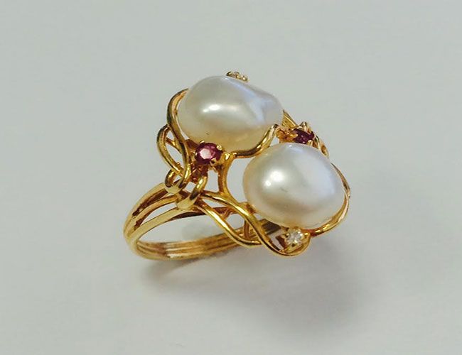 14K Y/G RING / 2 PEARLS / RUBY 0.09CT 2PCS, DIAMOND RD 0.04CT 2PCS