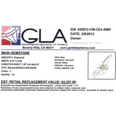 Diamond 1.07 ctw Solitaire 14k White Gold **|**|** 1.07ctw Diamond Solitaire 14k White Gold Ring K-L I-2 ; MSRP: $4327