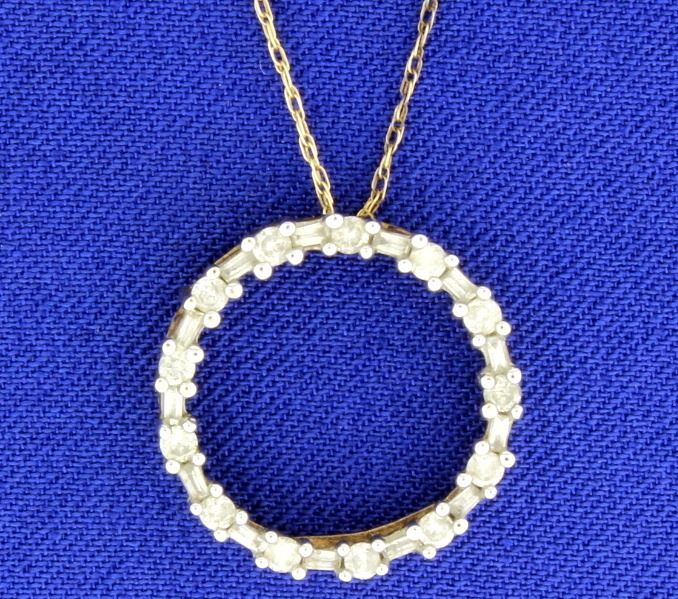 In 10K yellow gold, the chain is 19 inches long and the pendant is 3/4 inch in diameter and contains 1/2ct total weight of round and baguette diamonds. 2.2g