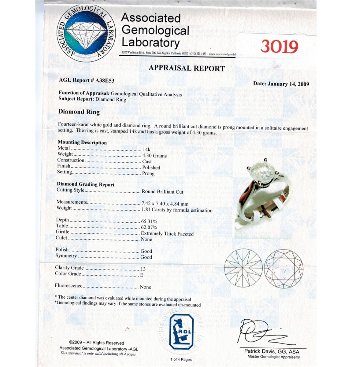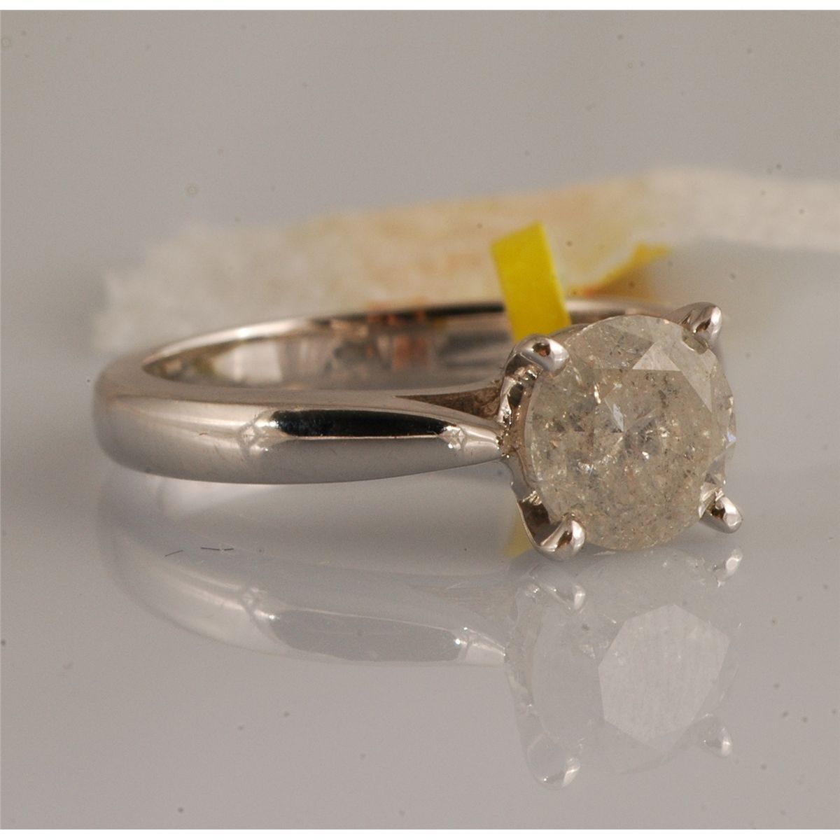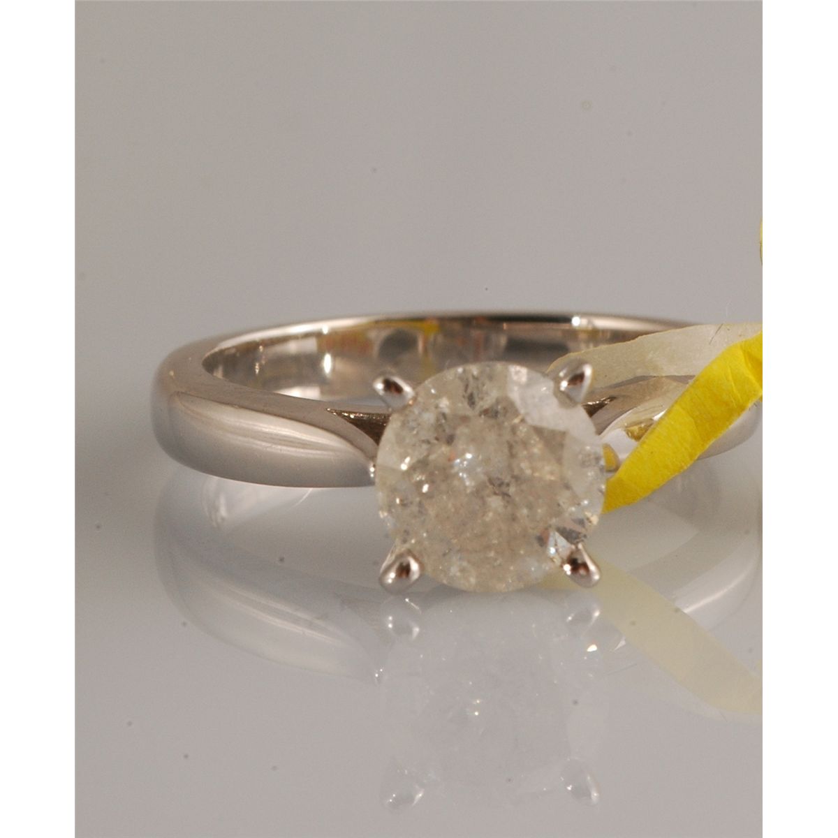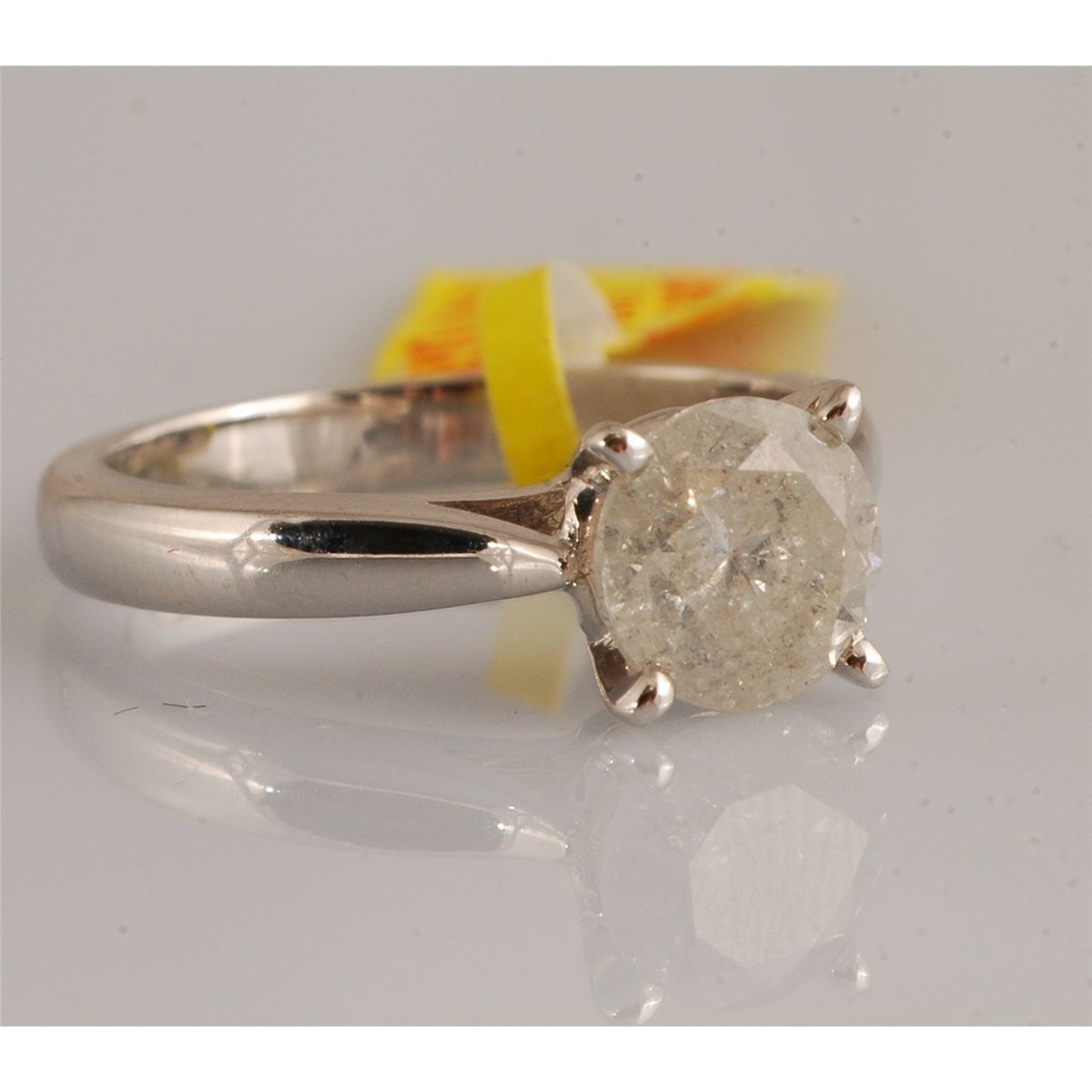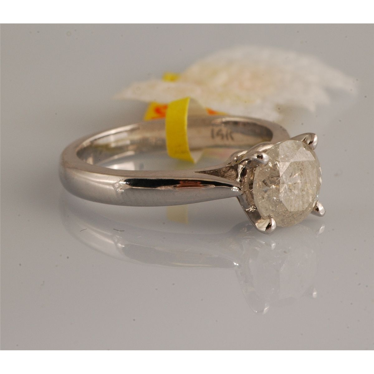 14K White gold and diamond (1.81 ct) ring. A round brilliant cut diamond is prong mounted in a solitaire engagement setting. The ring is cast, stamped 14K and has a gross weight of 4.30 grams.