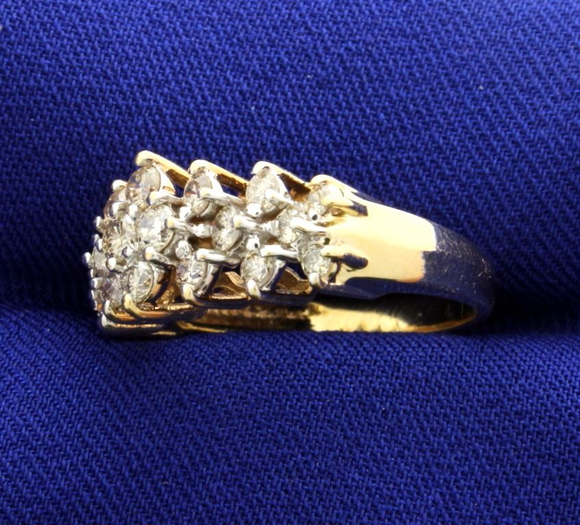 The diamonds are brilliant cut and have a clarity of SI-I1 and color J-K-L. Size 7. 3.5g