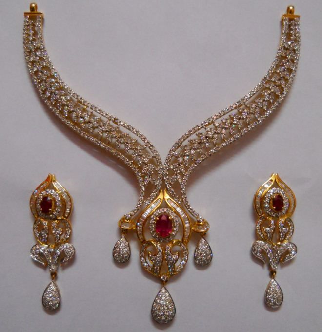 Diamond 12.16 Ctw ,Ruby 2.72 Ctw and 14kt Gold 51.858g Necklase and Earring Set