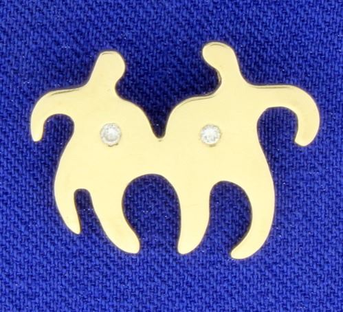 In 14K yellow gold, there are two .02ct round diamonds. Pendant is 7/8 inch long. 2.6g