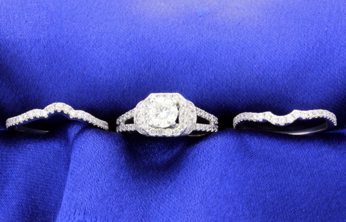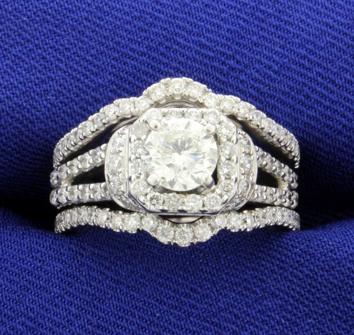 The center brilliant cut diamond is approx. 0.75 carats, clarity SI2-I1, and color J. There are 6 small diamonds set in the mounting and "halo". The clarity of the diamonds is SI and color H-I for total diamond weight of 0.75cts. There are 2 diamond shadow bands together total 1/2 carat. The size of the engagement is 6.25 and shadow bands are size 7. 8.0g