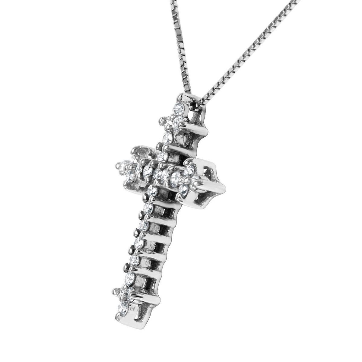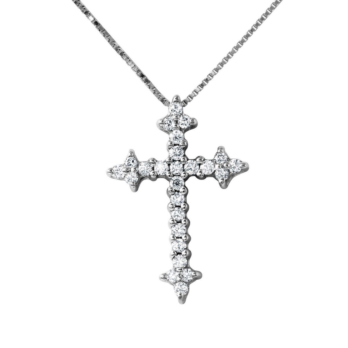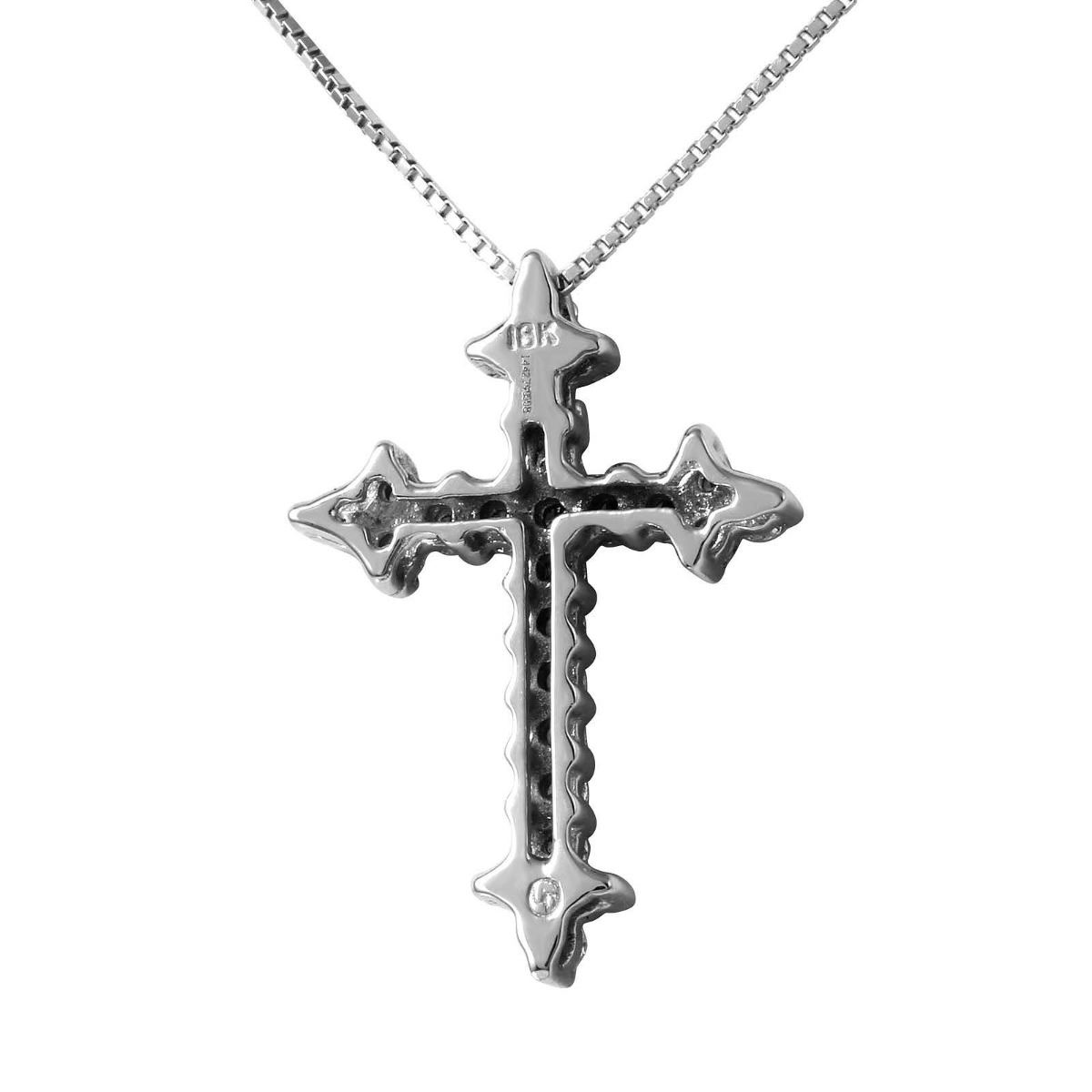 18KT White Gold diamond cross pendant with 0.25ctw of diamonds, strung on an 18 inch long chain. Measures 3/4" long x 1/2" wide. Total weight of necklace: 2.34 grams. The descriptions listed should not be construed as an appraisal. The detail is provided as a guideline for color, clarity, weights and measurements to the best of our ability. We welcome inspections. WE SHIP WORLDWIDE!