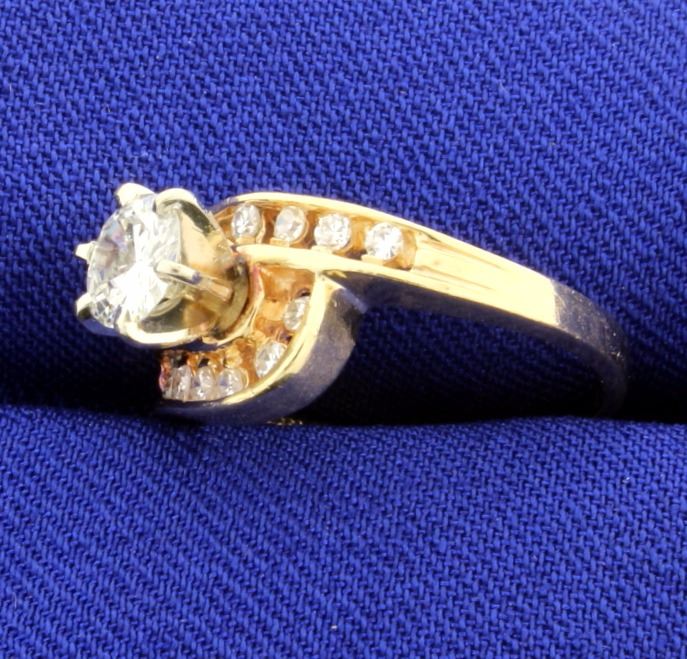 The center diamond weighs approx. .55 carats, clarity SI and color "J". There are 12 single cut diamonds channel set into band. Total weight of small diamonds 0.20 ct. Clarity SI, color "I-J" size 5. 3.0g