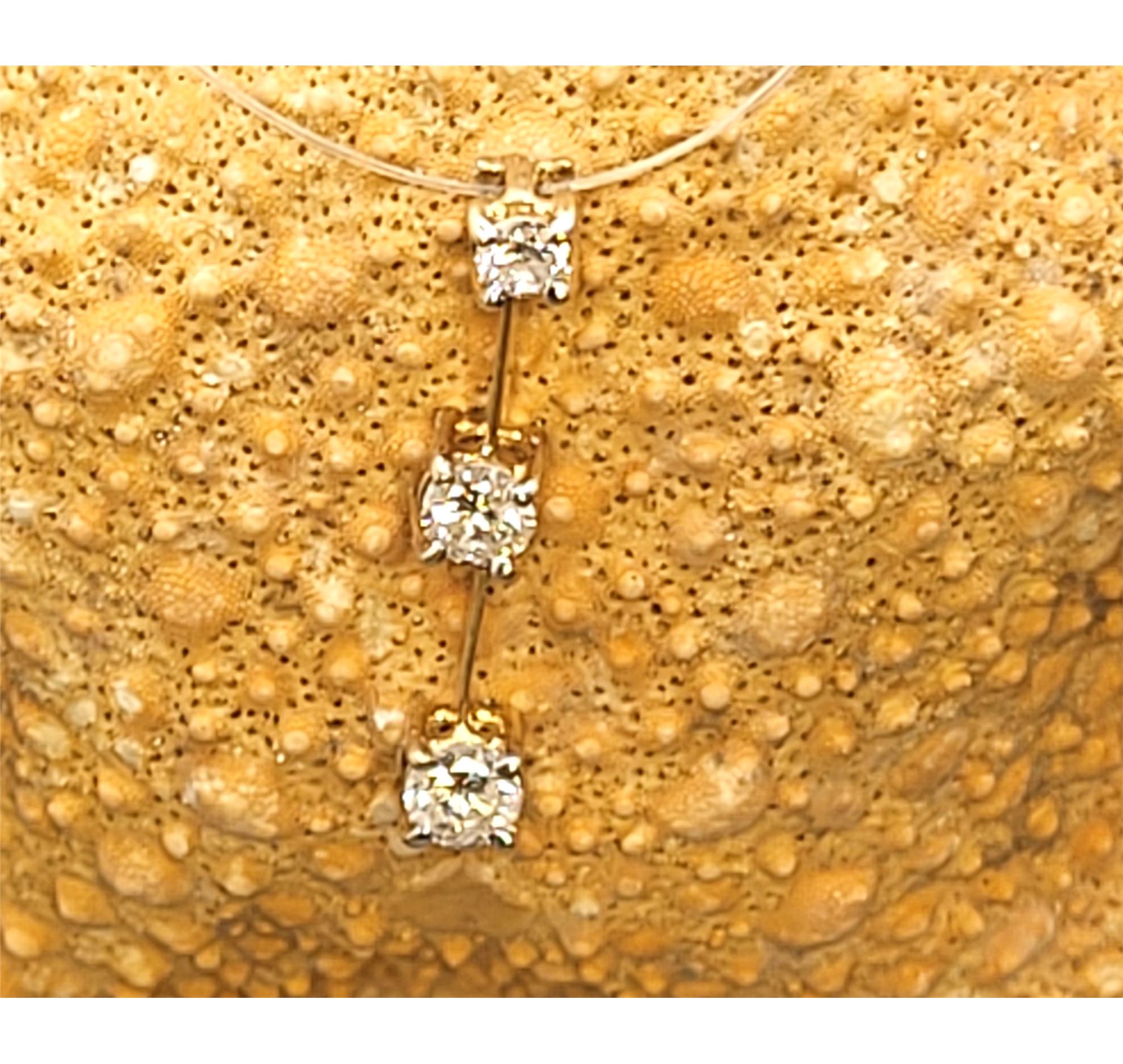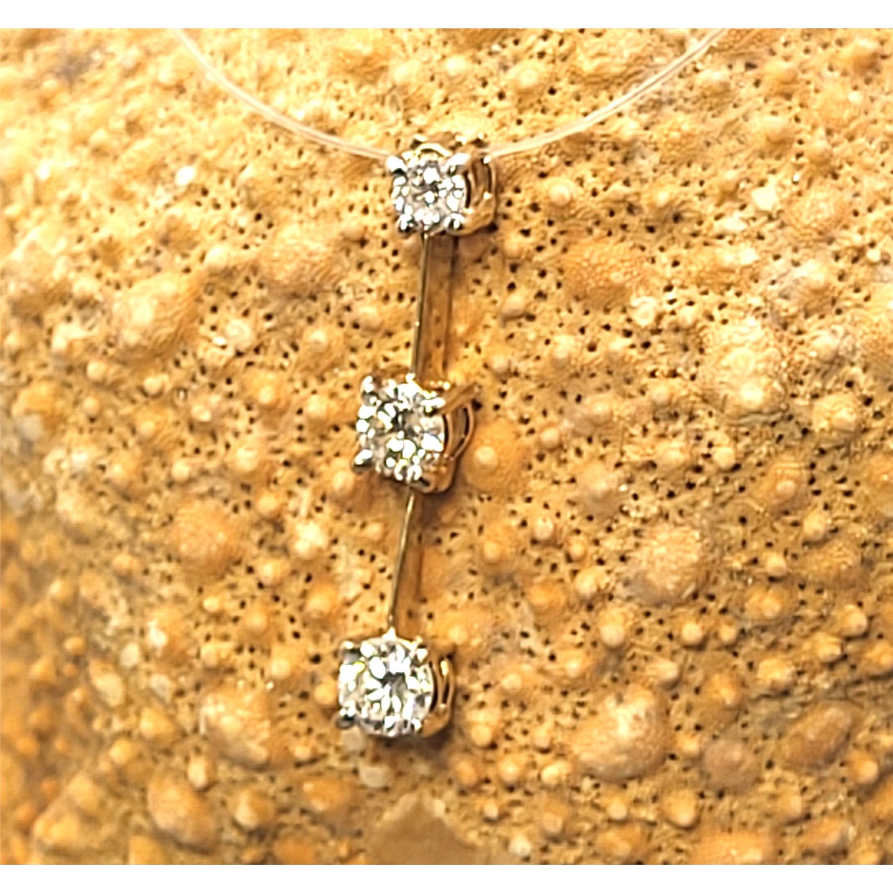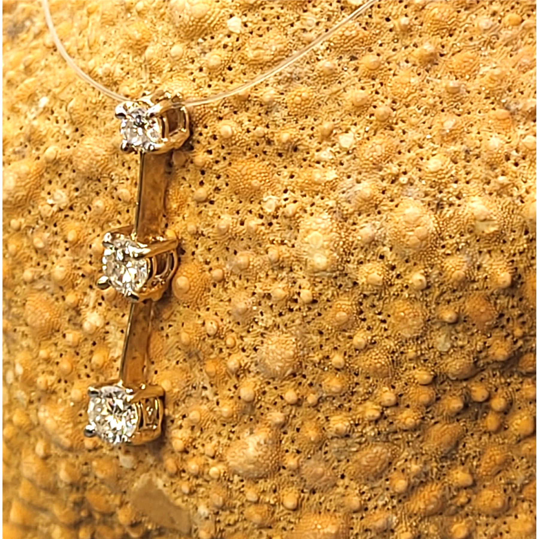 This is a 14 karat yellow gold pendant with three diamonds in a vertical row, that has long been associated with the Past, Present, and Future!& nbsp; There are approximately .60 carats total weight of H, SI2, round, brilliant-cut diamonds.& nbsp; The vertical pendant is constructed with 2 segments that are hinged together, allowing the pendant to move, as a dangling earring would.& nbsp; The pendant is approximately 7/8& quot; long with a built-in bail.& nbsp; The pendant bears the hallmark CI, for Caspian International, a jewelry manufacturing company that is/was in North Carolina. Admin: 12kj329/hh