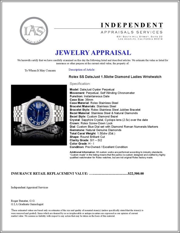 Dial: Custom Blue Dial set with Diamond Roman Numerals Markers
