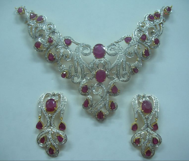 Diamond 8.99 Ctw ,Ruby 27.81 Ctw and 18 ktW/Gold 62.055g Necklase and Earring Set