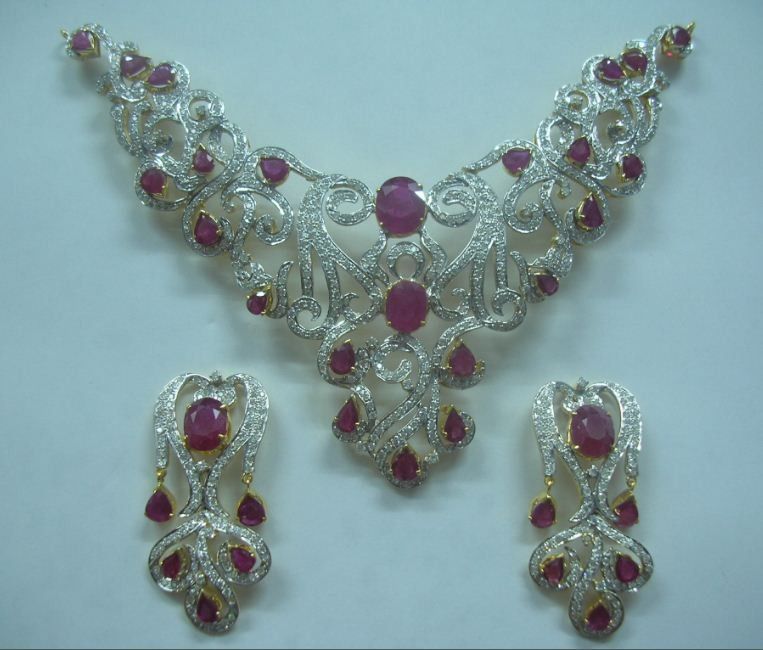 Necklase and Earring Set in 18kt White Gold:62.055g,Diamond:8.99 Ctw and Ruby:27.81 Ctw Total Weight :69.415g