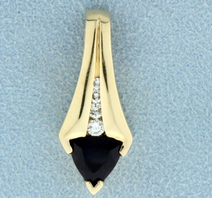 In 14K yellow gold, there are .2ct total weight of very high quality diamonds- one .1ct, one .05ct, one .03ct, & one .02ct diamonds- All VS clarity, G color. Also a 8mm trillion cut amethyst with deep purple color. It is 1 1/8 inches long. 6.3g