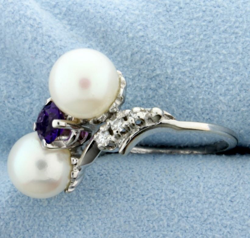 Diamond, Amethyst, and Pearl Ring in White Gold