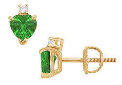 A pair of perfectly matched heart-shaped emeralds is set in a rich 14K yellow gold prong mounting. A round diamond is set on the top. These gemstone stud earrings have a total weight (TGW) of 2.04 ct and are available in either screw-back or push-back.