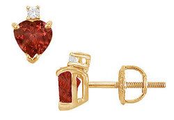 A pair of perfectly matched heart-shaped garnets is set in a rich 14K yellow gold prong mounting. A round diamond is set on the top. These gemstone stud earrings have a total weight (TGW) of 2.04 ct and are available in either screw-back or push-back.