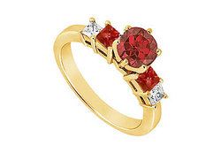 A round radiant ruby is set atop between two square rubies. Two diamonds on sides add a touch of style. Made in 14K yellow gold this engagement ring has a total gem weight (TGW) of 1.50 ct.