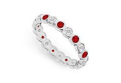 Creating a fine contrast of vibrant red and soothing white this vivacious eternity band is bezel-set with alternating round rubies and brilliant-cut diamonds. Made in 14K white gold this eternity band has a total gem weight (TGW) of 1.00 carat. A perfect gift for any July born as Ruby is Julys birthstone.