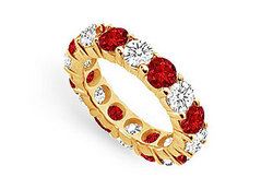 Creating a fine contrast of vibrant red and soothing white this vivacious eternity band is prong-set with alternating round rubies and brilliant-cut diamonds. Made in 14K yellow gold this eternity band has a total gem weight (TGW) of 5.00 ct. A perfect gift for any July born as Ruby is Julys birthstone.