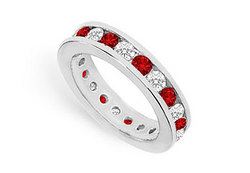 Creating a fine contrast of vibrant red and soothing white this vivacious eternity band is channel-set with alternating round rubies and brilliant-cut diamonds. Made in 18K white gold this eternity band has a total gem weight (TGW) of 2.00 ct. A perfect gift for any July born as Ruby is Julys birthstone