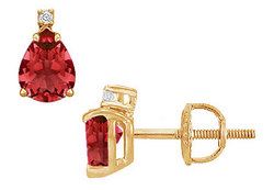 A pair of perfectly matched pear-shaped rubies is set in a rich 14K yellow gold prong mounting. A round diamond is set on the top. These gemstone stud earrings have a total weight (TGW) of 2.04 ct and are available in either screw-back or push-back.