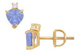 A pair of perfectly matched heart-shaped tanzanites is set in a rich 14K yellow gold prong mounting. A round diamond is set on the top. These gemstone stud earrings have a total weight (TGW) of 2.04 ct and are available in either screw-back or push-back.