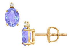 A pair of perfectly matched oval tanzanites is set in a rich 14K yellow gold prong mounting. A round diamond is set on the top. These gemstone stud earrings have a total weight (TGW) of 2.04 ct and are available in either screw-back or push-back.