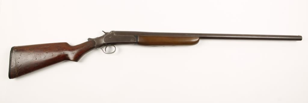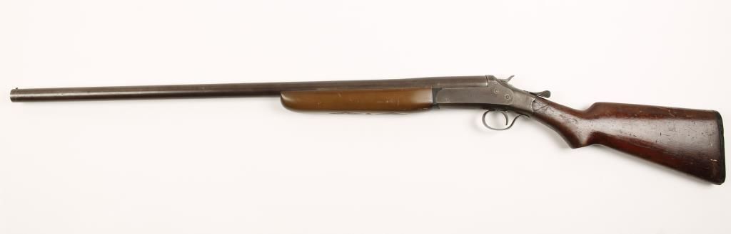 Single shot top break exposed hammer shotgun. metal suf\rfaces have turned a mottled brown from surface rust. Edge wear through the bluing on the high edges. Butt plate has a chip out of the heel. Butt has a crack leading back from the receiver and many scratches and dings. Fore end appears to be a later replacement. The bore is bright and clean. *Curio & Relic*