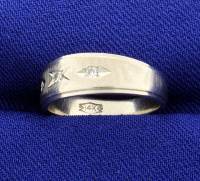 In 14K white gold, there are three high quality .02ct diamonds. Size 5 1/4 3.2g