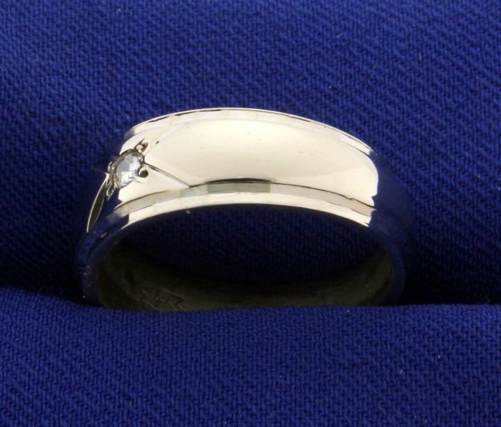In 14K white gold, contains a .05ct high quality round brilliant diamond that is VS clarity, G color. Size 7 5.3g