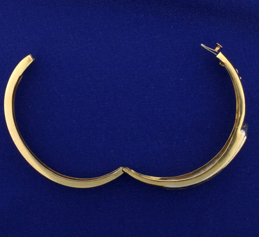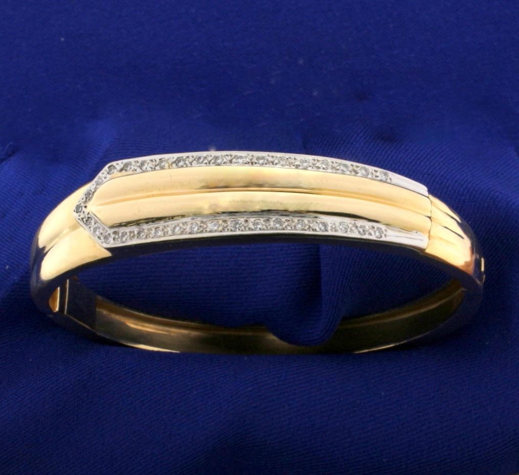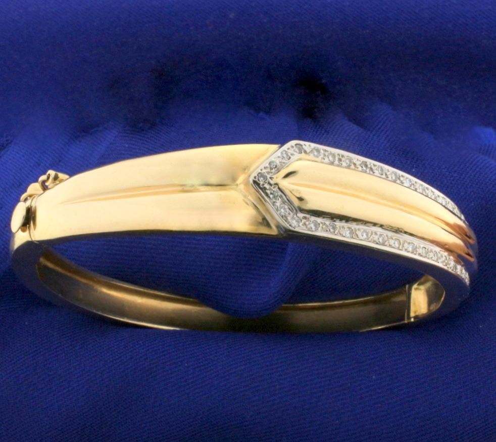 14k yellow gold. Contains 1/4 ct TW of high quality round brilliant diamonds, SI clarity/H color. 2.3/8 inch inside diameter. Has safety clasp and hinges open/close for easy putting on and taking off. 23.0g