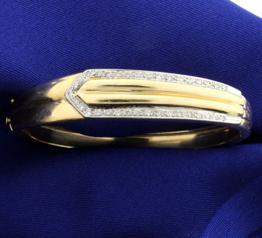 14k yellow gold. 1/4 ct of great color, vibrant diamonds. 2.5 inch diameter. Has safety clasp and is in great condition. 23.0g