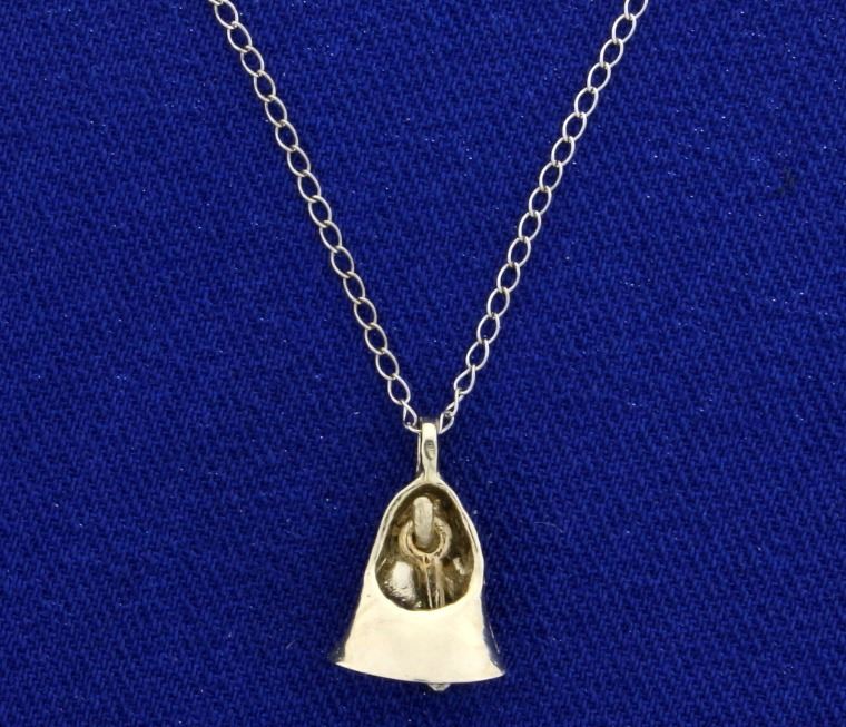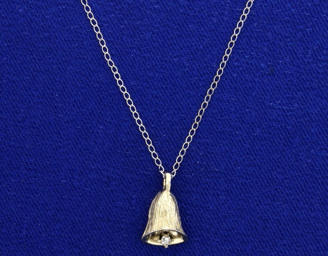 In 14k white gold. Contains a high quality .02ct round diamond as the bell's clapper/striker, VS clarity/G color. 1/2" long pendant with bale and 18" long neck chain. 1.3g.