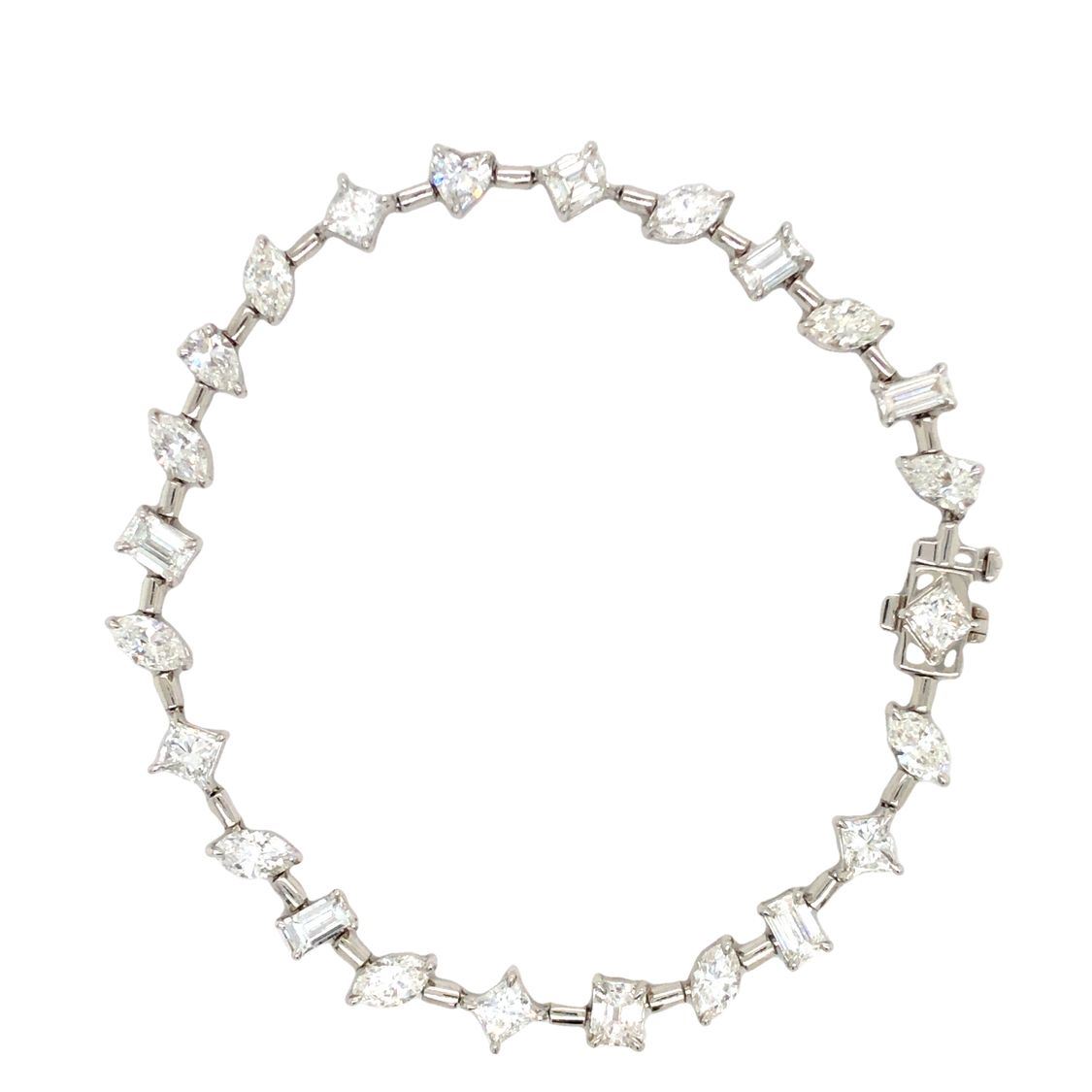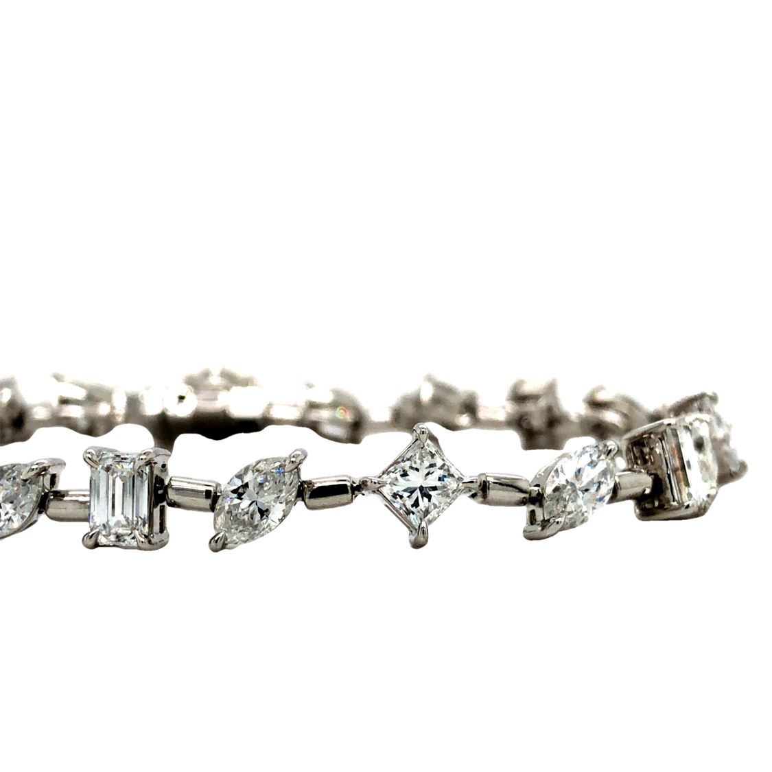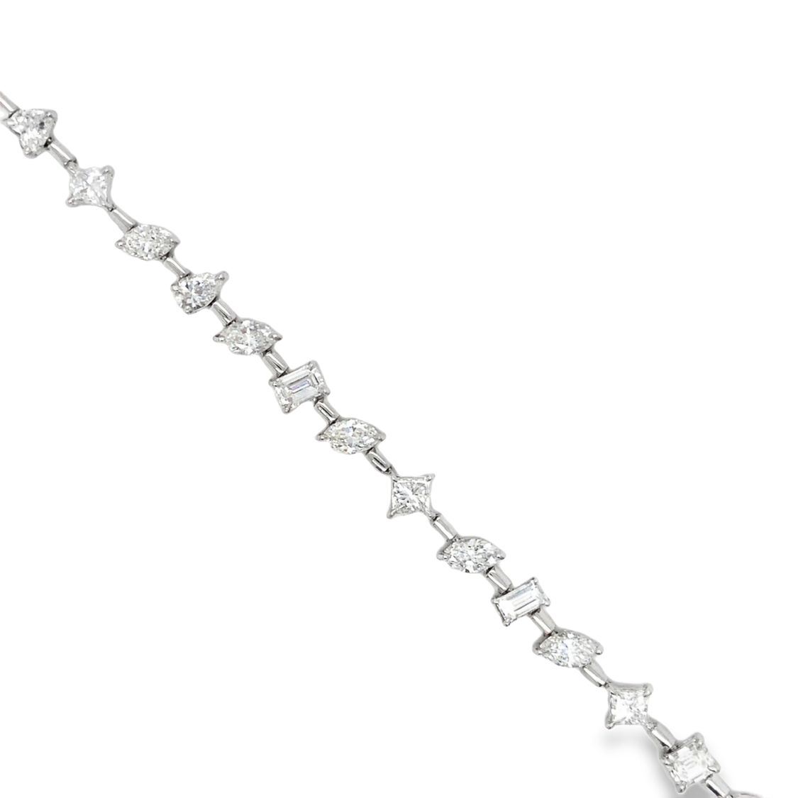 PAD8554-15 / ATSS TITLE DESCRIPTION: Fancy 18K White Gold Vari-Cut Diamond Line Bracelet DESCRIPTION DETAIL: OVERALL CONDITION: Excellent, New DIAMONDS: Natural (5) Weight: 1.25 Carats Total Weight Shape: Princess Cut Color: G-H Clarity: VS1-SI2 DIAMONDS: Natural (9) Weight: 2.27 Carats Total Weight Shape: Marquise Brilliant Cut Color: G-H Clarity: VS2-SI1 DIAMONDS: Natural (7) Weight: 2.04 Carats Total Weight Shape: Emerald Cut Color: G-H Clarity: VS1-SI1 DIAMONDS: Natural (2) Weight: .48 Carats Total Weight Shape: Pear Brilliant Cut Color: G-H Clarity: VS1-SI2 DIAMONDS: Natural (1) Weight: .29 Carats Total Weight Shape: Heart, Brilliant Cut Color: G Clarity: SI1 METAL: 18K White Gold WEIGHT: 12.92 Grams SIZE: 7" Additional Information: Stamped "Italy, 18K" APPRAISAL REPORT: JBM certified and appraised this bracelet with an estimated retail replacement value of $19,526.00. THIS ITEM IS FROM AN ORDERED LIQUIDATION OF A MAJOR JEWELRY MANUFACTURER'S OVERSTOCKED INVENTORY. Please inquire about sizing if needed, and allow an additional 10 days for shipping if we resize it. PRIOR TO BIDDING READ THE DESCRIPTION CAREFULLY This description and condition report is provided for your convenience based on the information provided by the consignor. Buyers Premium: 18% Shipping Billed Separately Payment Due in 5 days All items shipped to registered address - NO EXCEPTIONS PAD8554-15 / ATSS