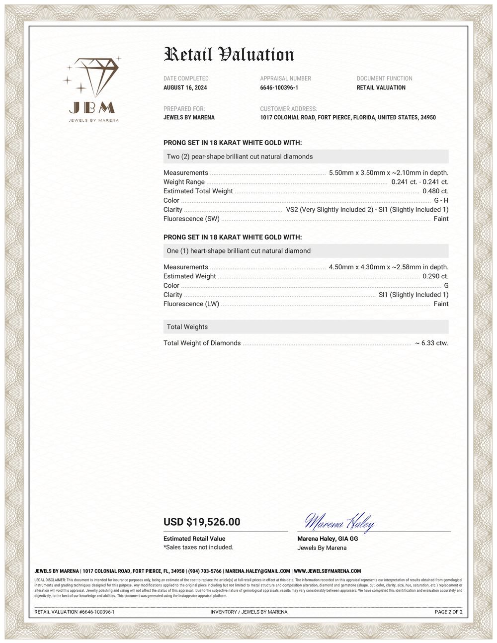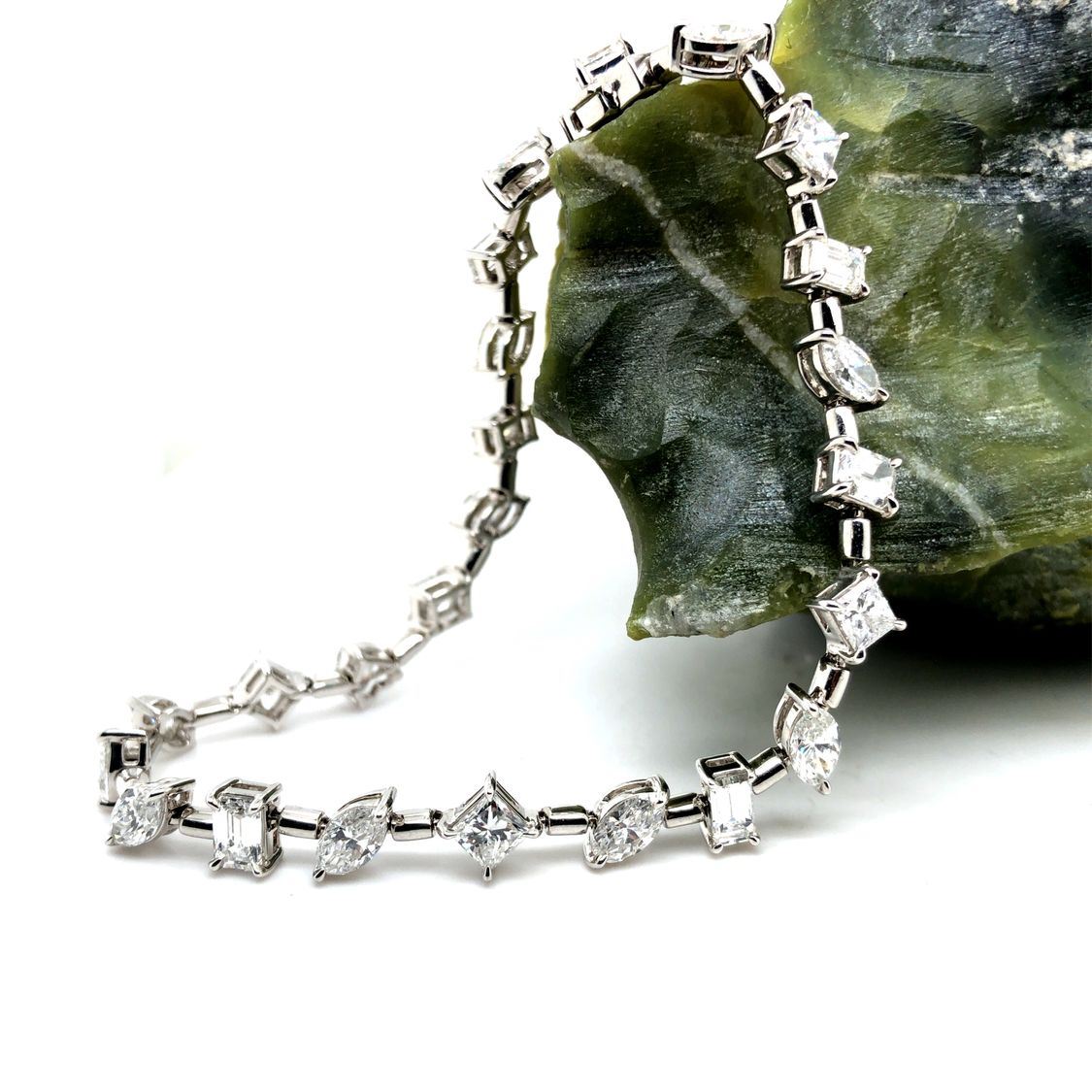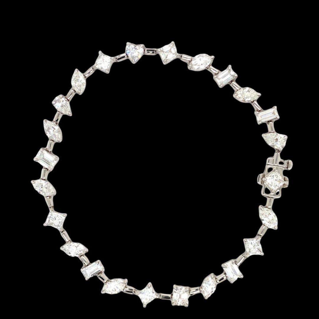 PAD8554-15 / ATSS TITLE DESCRIPTION: Fancy 18K White Gold Vari-Cut Diamond Line Bracelet DESCRIPTION DETAIL: OVERALL CONDITION: Excellent, New DIAMONDS: Natural (5) Weight: 1.25 Carats Total Weight Shape: Princess Cut Color: G-H Clarity: VS1-SI2 DIAMONDS: Natural (9) Weight: 2.27 Carats Total Weight Shape: Marquise Brilliant Cut Color: G-H Clarity: VS2-SI1 DIAMONDS: Natural (7) Weight: 2.04 Carats Total Weight Shape: Emerald Cut Color: G-H Clarity: VS1-SI1 DIAMONDS: Natural (2) Weight: .48 Carats Total Weight Shape: Pear Brilliant Cut Color: G-H Clarity: VS1-SI2 DIAMONDS: Natural (1) Weight: .29 Carats Total Weight Shape: Heart, Brilliant Cut Color: G Clarity: SI1 METAL: 18K White Gold WEIGHT: 12.92 Grams SIZE: 7" Additional Information: Stamped "Italy, 18K" APPRAISAL REPORT: JBM certified and appraised this bracelet with an estimated retail replacement value of $19,526.00. THIS ITEM IS FROM AN ORDERED LIQUIDATION OF A MAJOR JEWELRY MANUFACTURER'S OVERSTOCKED INVENTORY. Please inquire about sizing if needed, and allow an additional 10 days for shipping if we resize it. PRIOR TO BIDDING READ THE DESCRIPTION CAREFULLY This description and condition report is provided for your convenience based on the information provided by the consignor. Buyers Premium: 18% Shipping Billed Separately Payment Due in 5 days All items shipped to registered address - NO EXCEPTIONS PAD8554-15 / ATSS