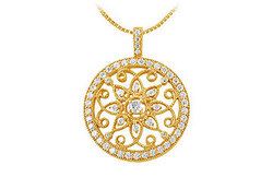 An intricate flower motif is made in this open circle. The design is adorned with brilliant-cut round diamonds. Crafted in 14K yellow gold this pendant has a total weight (TDW) of 0.75 ct.