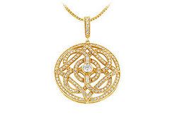 Multiple geometric figures circles and squares are made in this circle. Brilliant-cut round diamonds are set all over. Made in 14K yellow gold this pendant has a total weight (TDW) of 1.00 ct.