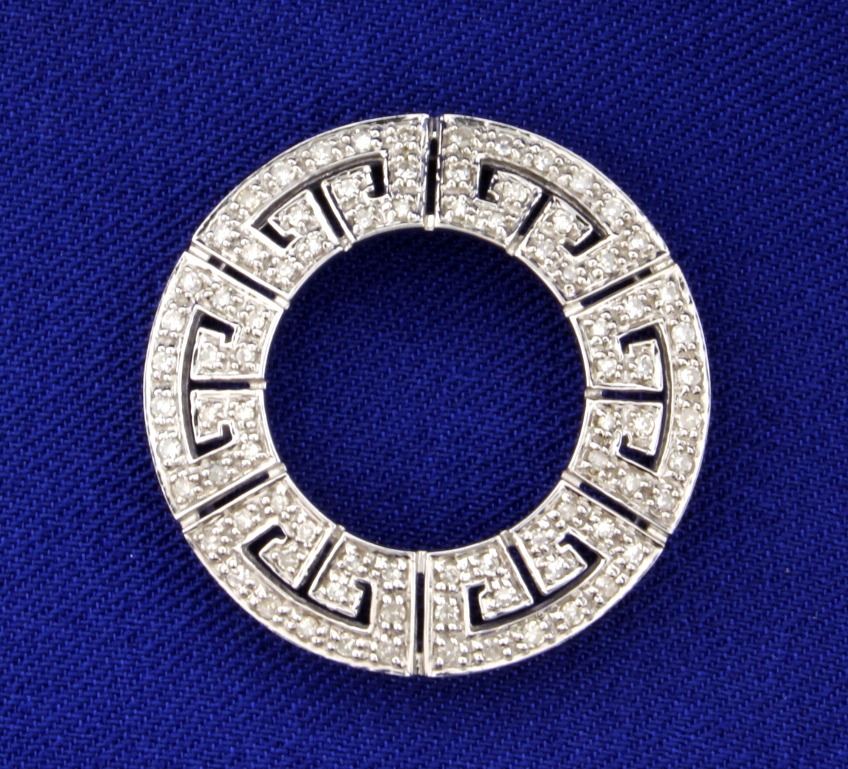 In 14K white gold, it is just over 1 inch in diameter. It contains eighty four 1/2pt round diamonds. 5.4g